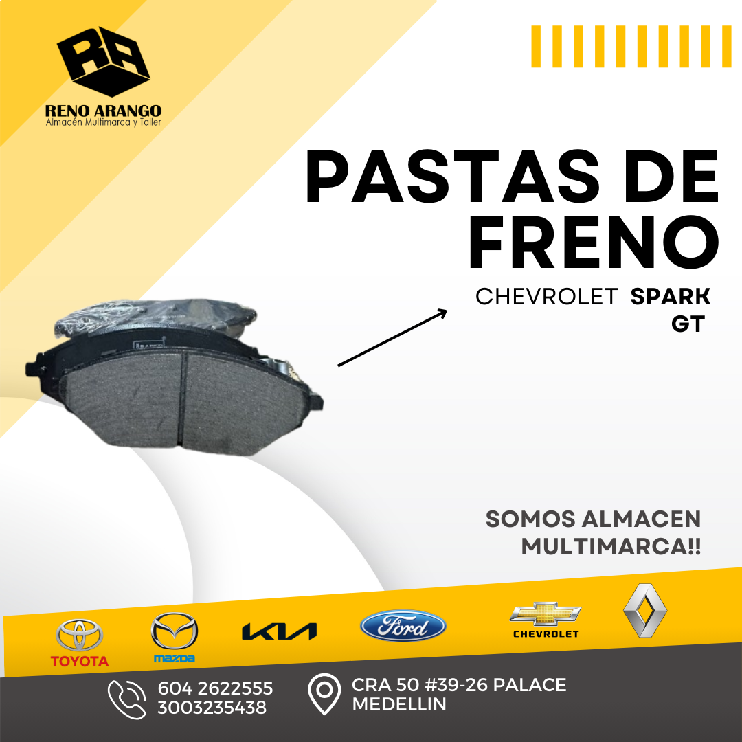 Pastas para frenos Chevrolet Spark Gt frenado seguro y estable, con excelente respuesta y durabilidad. Ideales para reemplazo por desgaste; disponibles para cotización y entrega en Medellín.